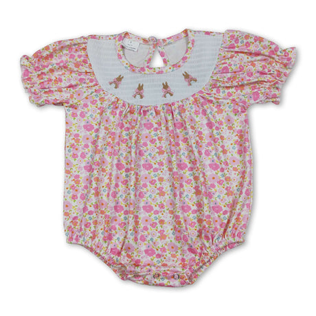 Short sleeves pink floral rabbit smocked baby Easter romper