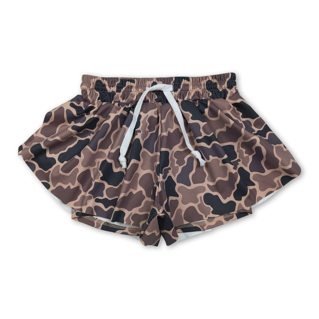 Brown camo kids girls summer active shorts - 3-6M is backordered and will ship as soon as it is back in stock.