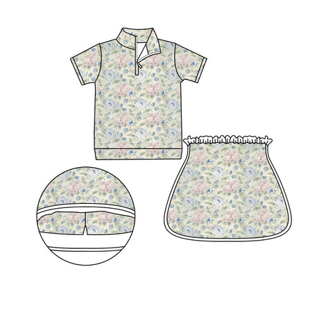 Short sleeves pink blue floral zip pullover skirt girls clothes