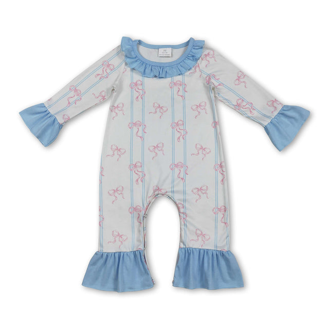 Long sleeves pink bow stripe ruffle baby girls romper - 0-3M is backordered and will ship as soon as it is back in stock.