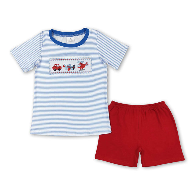 Blue stripe transportation shirt red shorts boys clothes - 3-6M is backordered and will ship as soon as it is back in stock.