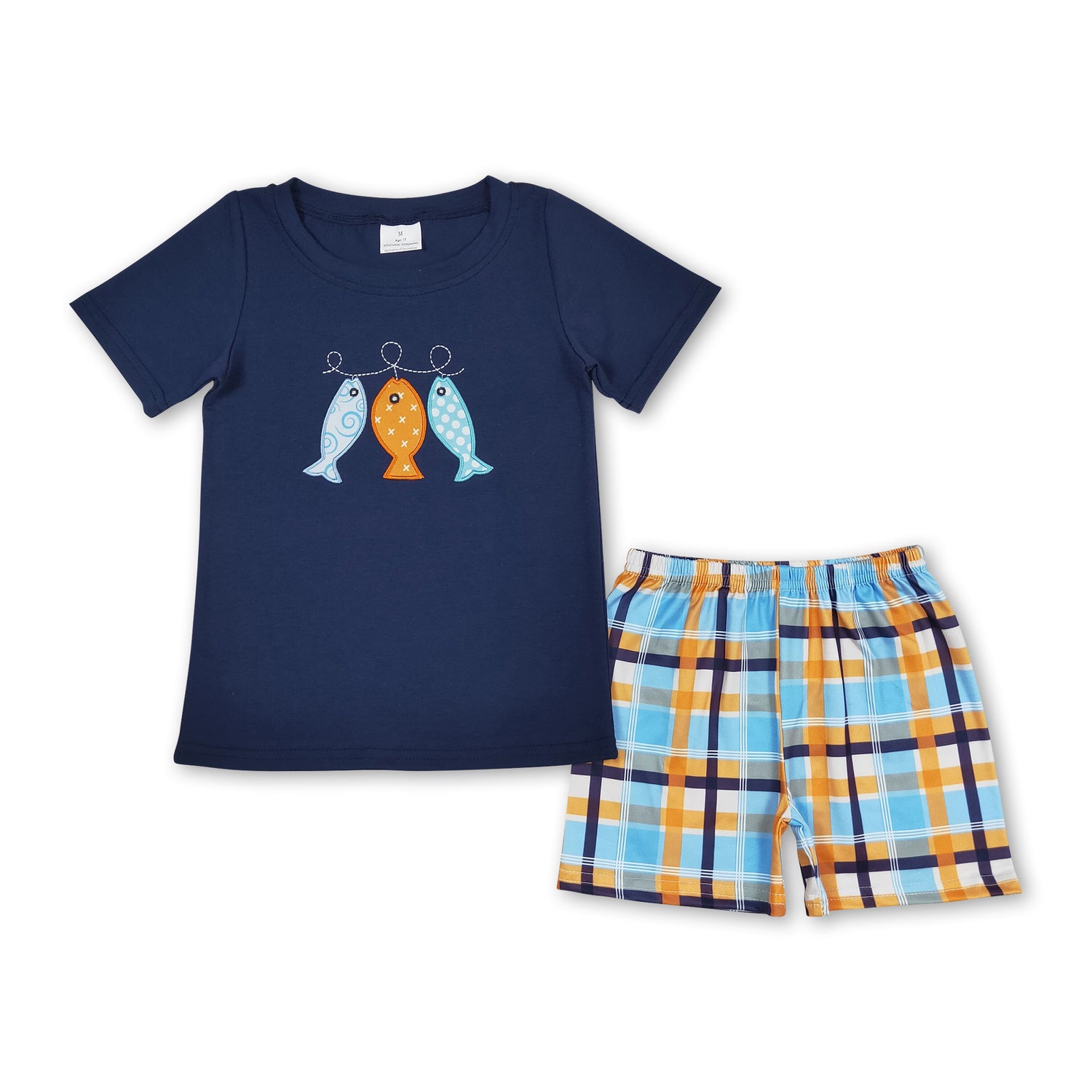 Navy fish top plaid shorts boys summer clothes - 3-6M is backordered and will ship as soon as it is back in stock.