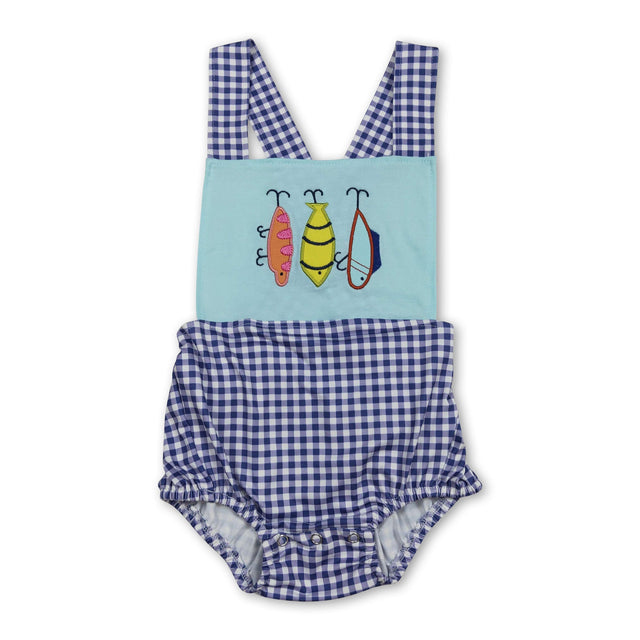 Blue plaid straps fishing baby boy summer romper