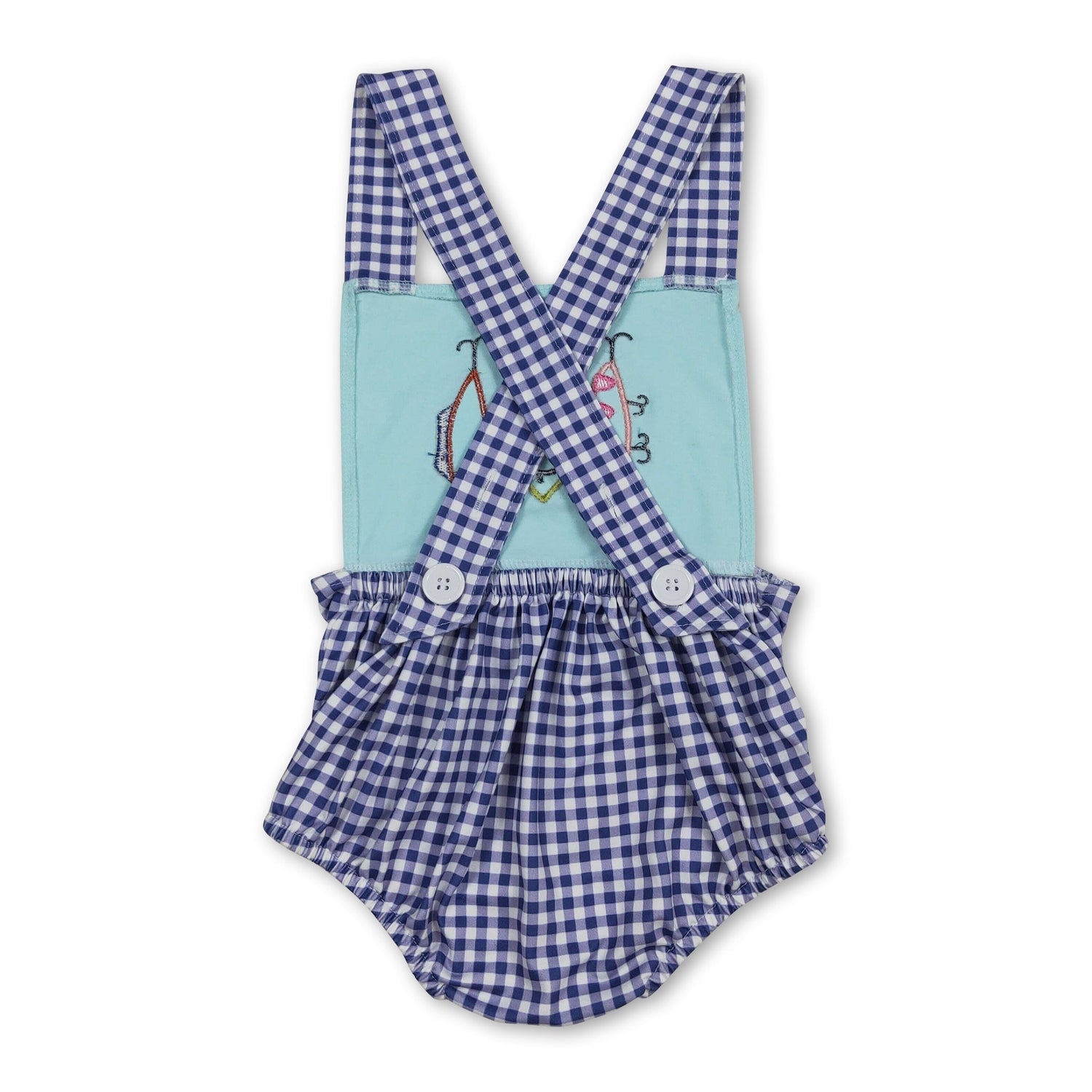 Blue plaid straps fishing baby boy summer romper - 0-3M is backordered and will ship as soon as it is back in stock.