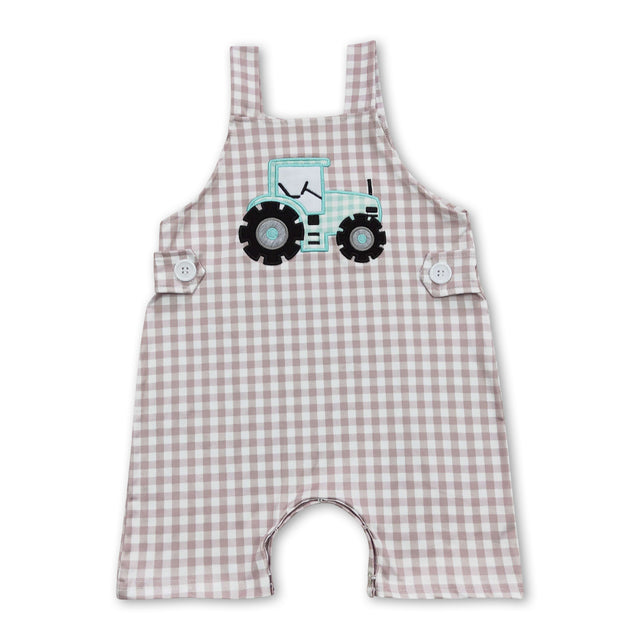 Khaki plaid tractor sleeveless baby boy farm romper - 0-3M is backordered and will ship as soon as it is back in stock.