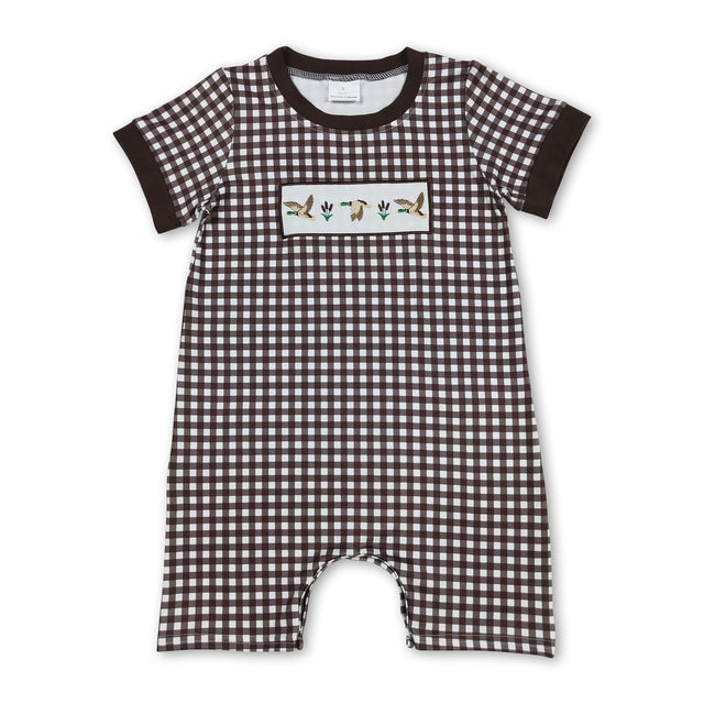 Short sleeves brown plaid duck baby boy romper - 0-3M is backordered and will ship as soon as it is back in stock.