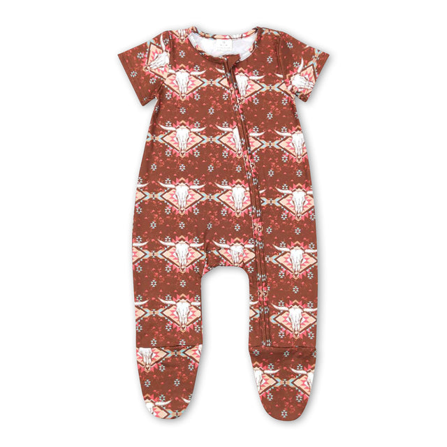 Short sleeves bull skull aztec baby footed zipper coveralls