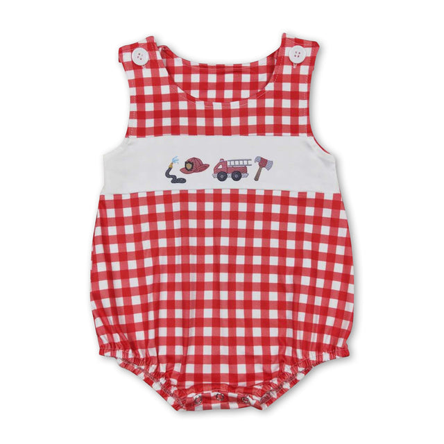 Sleeveless red plaid fire truck baby boys summer romper
