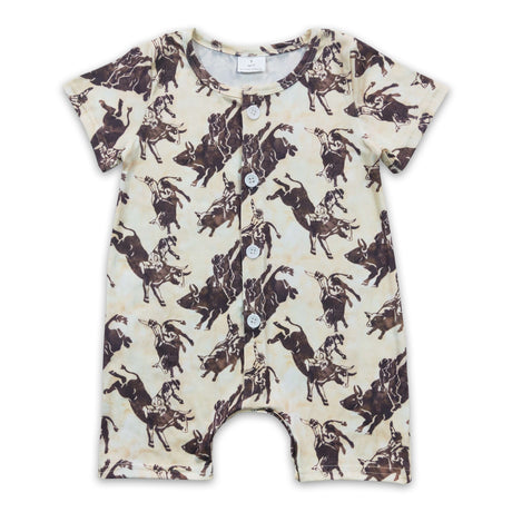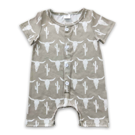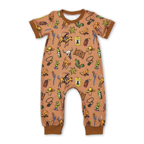 Short sleeves brown bull skull western baby rodeo romper