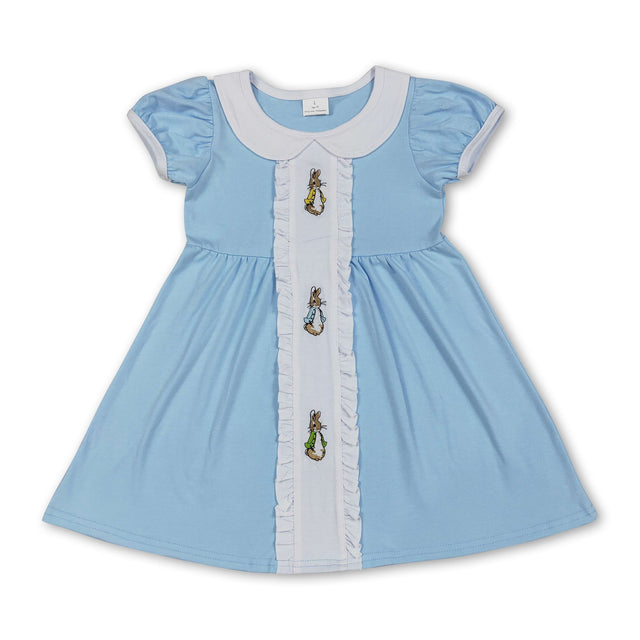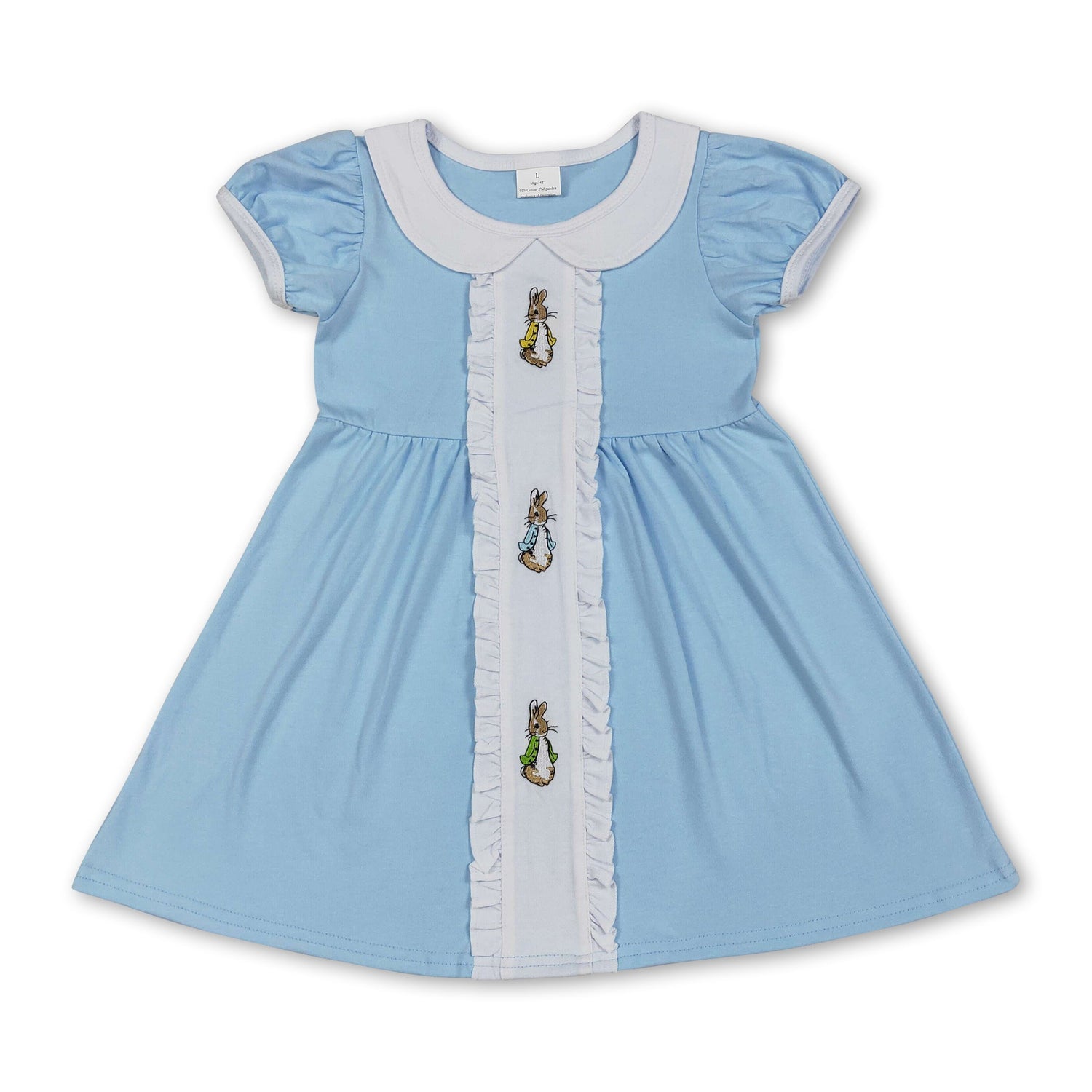 Light blue short sleeves rabbit embroidery girls Easter dress