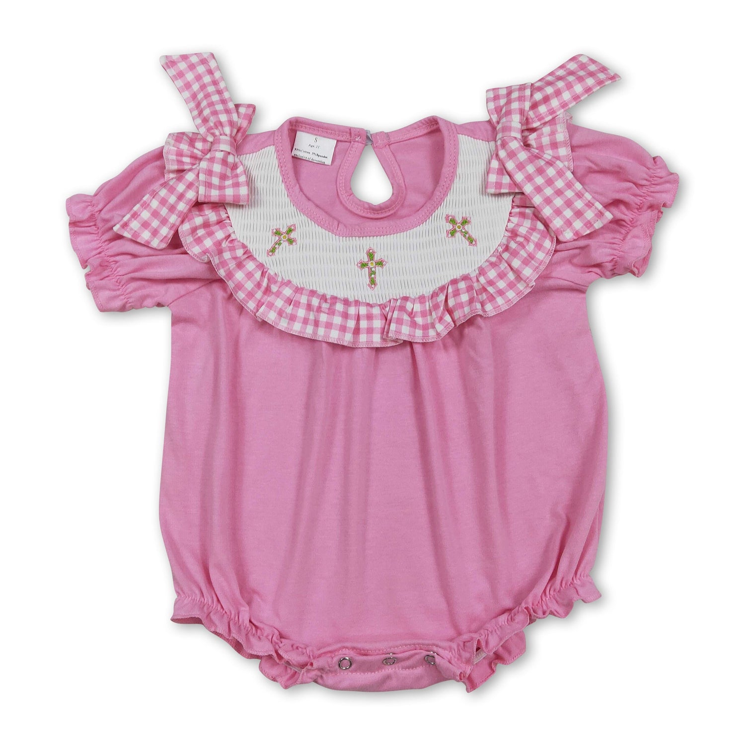 Pink short sleeve cross smocked baby girl Easter romper - 0-3M is backordered and will ship as soon as it is back in stock.