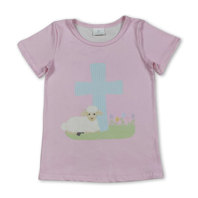 Pink short sleeves cross goat kids girls Easter shirt - 3-6M is backordered and will ship as soon as it is back in stock.