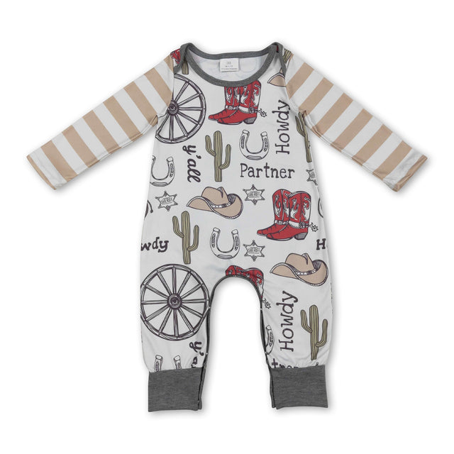 Stripe long sleeves cactus boots western boy romper