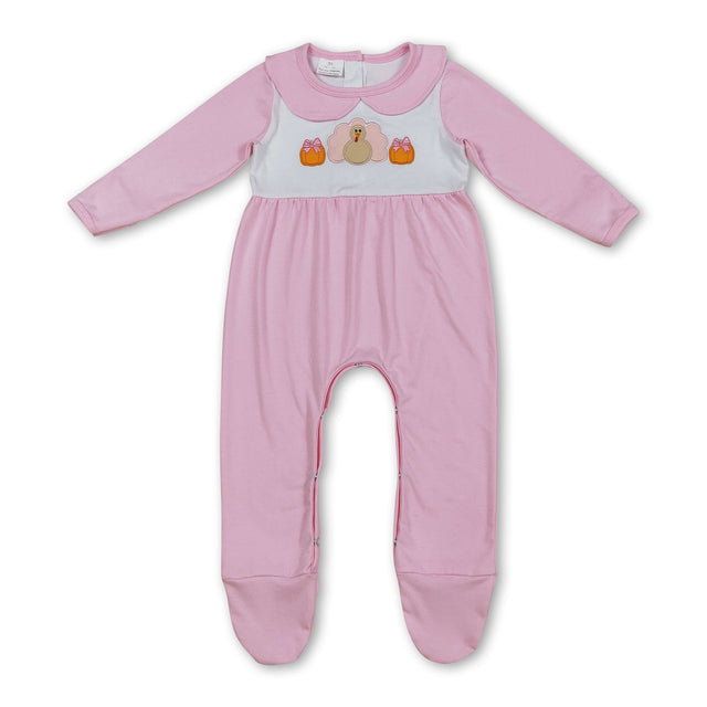 Pink pumpkin turkey baby girl Thanksgiving footed romper