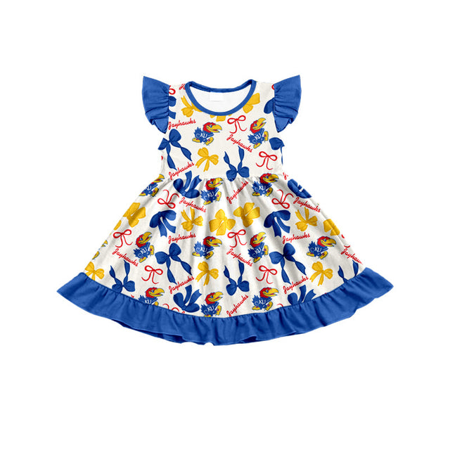 MOQ 3 pcs flutter sleeves K U blue bows girls team dress - 3-6M is backordered and will ship as soon as it is back in stock.
