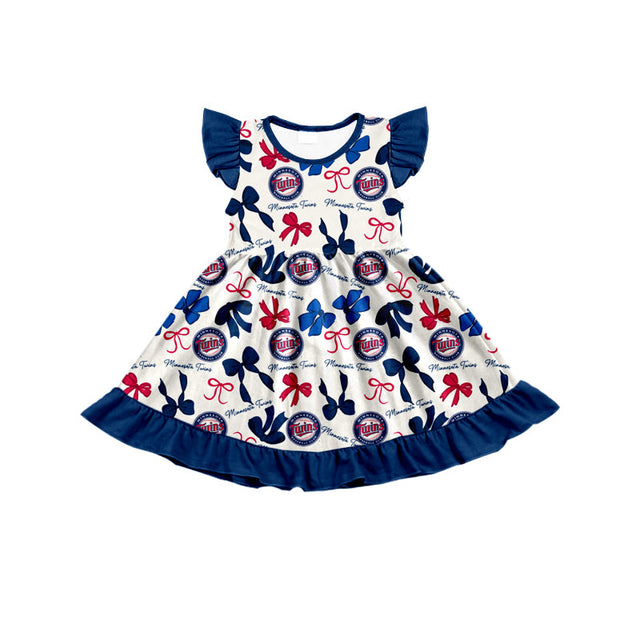 MOQ 3 pcs flutter sleeves T navy bows girls team dress