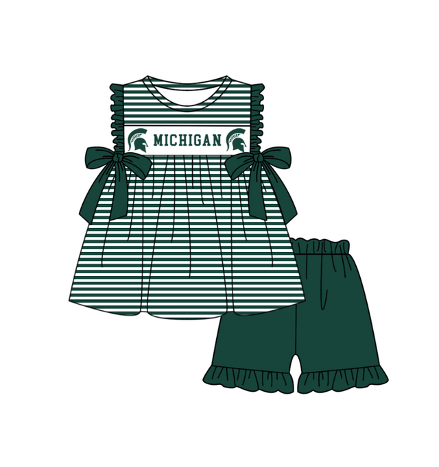 MOQ 5 pcs green stripe bow MICHIGAN tunic ruffle shorts girls team outfit