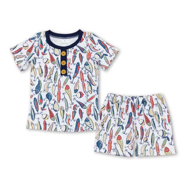 Short sleeves fishing print kids boys summer pajamas - 3-6M is backordered and will ship as soon as it is back in stock.