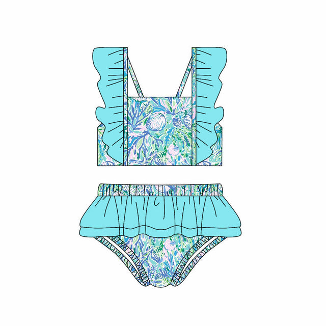 Flutter sleeves watercolor seaweed girls summer swimsuit