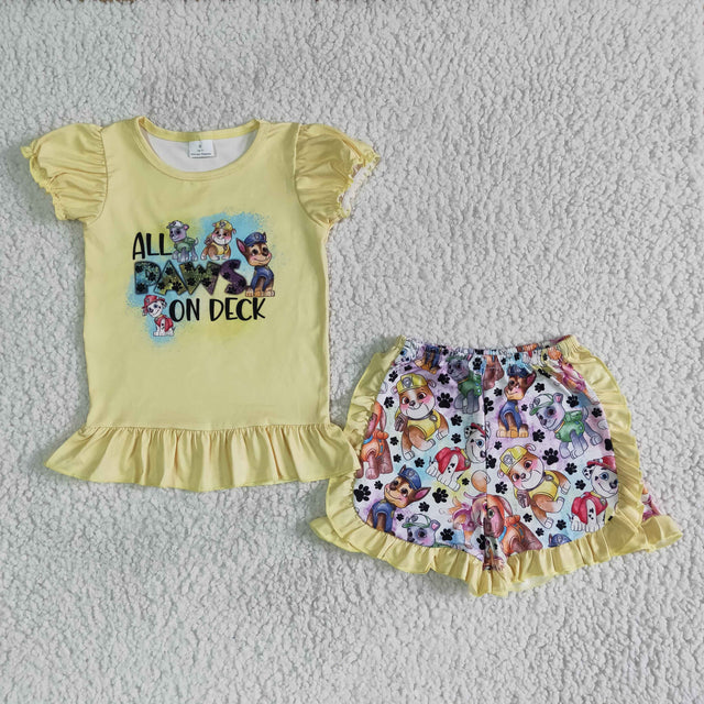 Dog print yellow shirt ruffle shorts girls summer clothing
