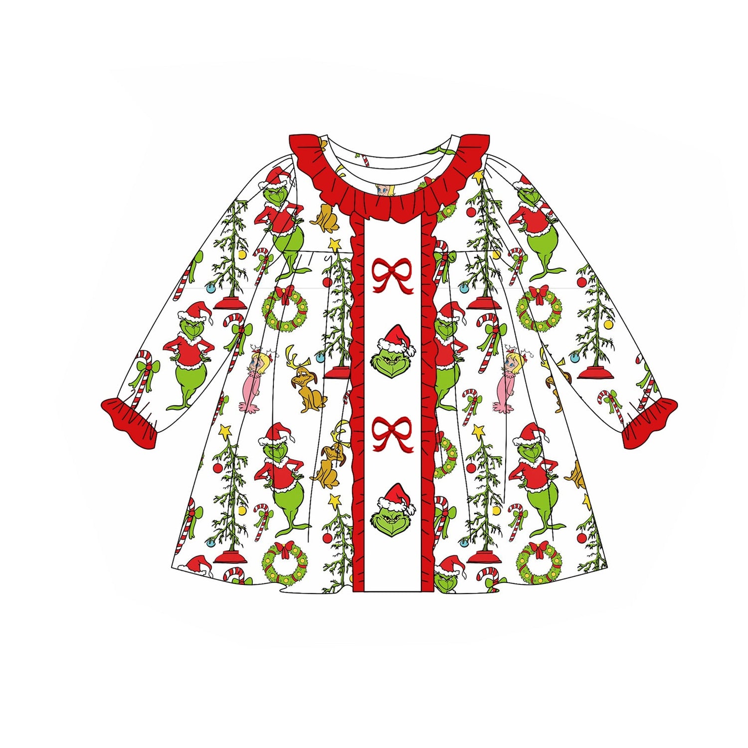 Long sleeves green face bow kids girls Christmas dresses - 3-6M is backordered and will ship as soon as it is back in stock.