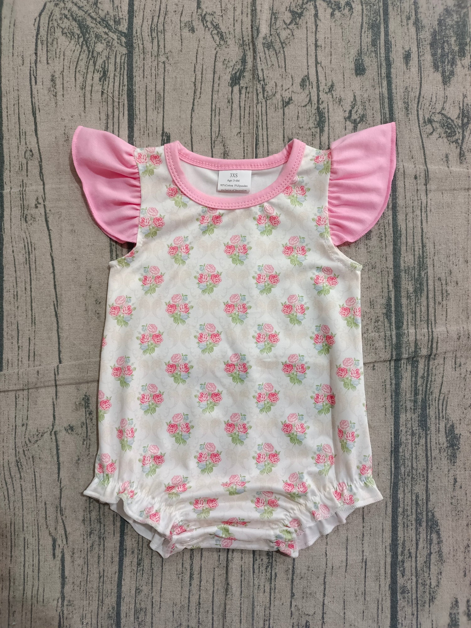Pink flutter sleeves floral baby girls summer romper - 0-3M is backordered and will ship as soon as it is back in stock.