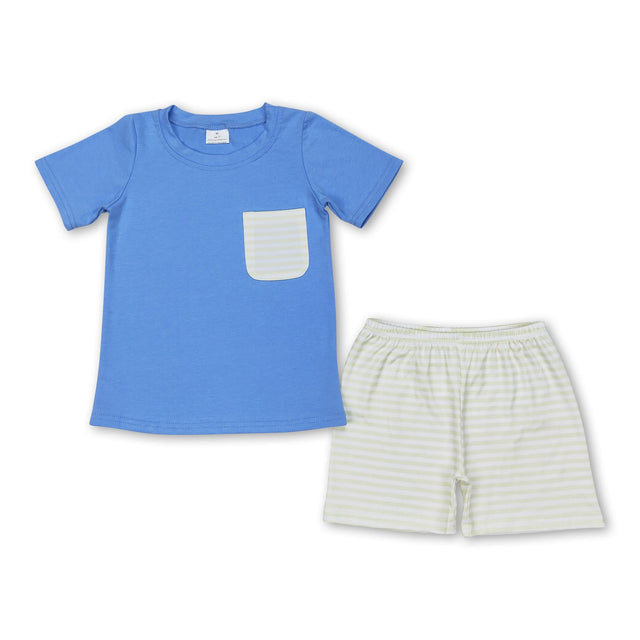 Short sleeves blue pocket top stripe shorts boys clothes