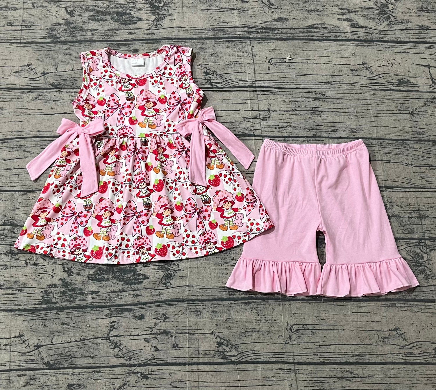 Sleeveless strawberry bow tunic ruffle shorts girls outfits