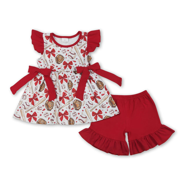 Flutter sleeves red bow baseball kids girls clothing set