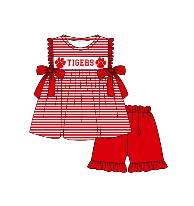 MOQ 5 pcs red stripe bow TIGERS tunic ruffle shorts girls team outfit