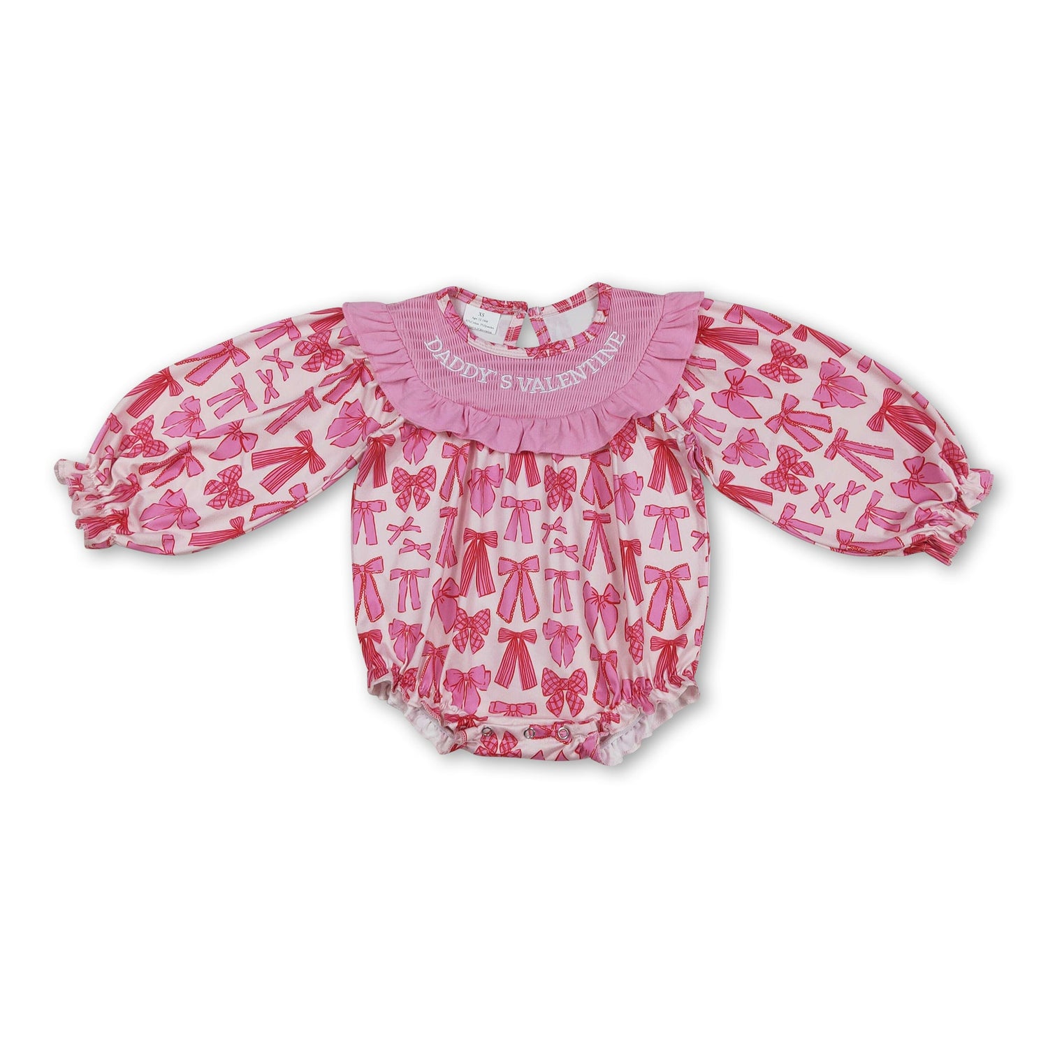 Pink bow daddy's valentine smocked baby girls romper - 0-3M is backordered and will ship as soon as it is back in stock.