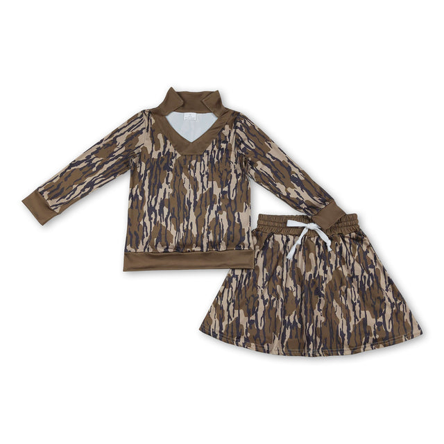 Long sleeves olive camo top skirt girls clothing set