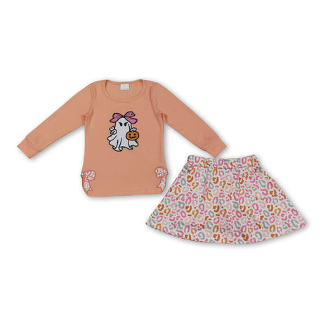 Pumpkin ghost embroidery top leopard skirt girls Halloween set