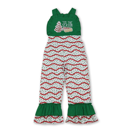 Green ruffle straps 'Tis the season Christmas tree cake girls jumpsuit