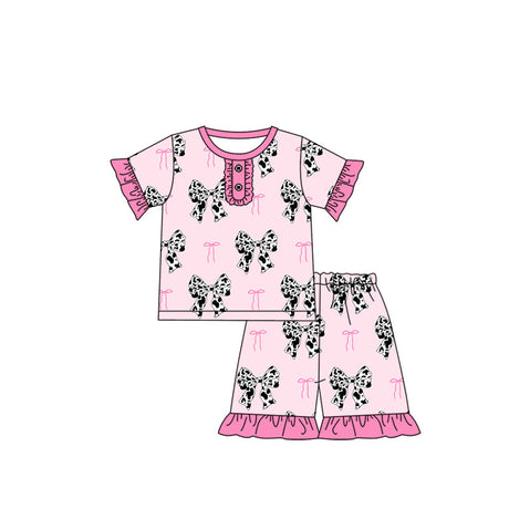 Pink ruffle short sleeves cow print bow baby girls pajamas