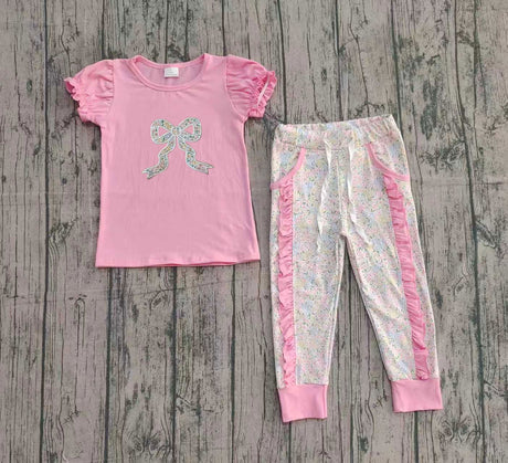 From $2100Unit price /UnavailablePink short sleeves bow top floral ruffle pants girls clothes
