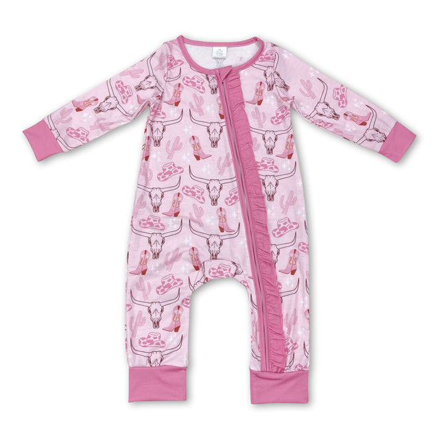 Pink boots cactus bull skull baby girls zipper romper - 0-3M is backordered and will ship as soon as it is back in stock.