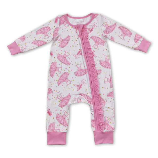 Pink dance ruffle long sleeves baby girls zipper romper