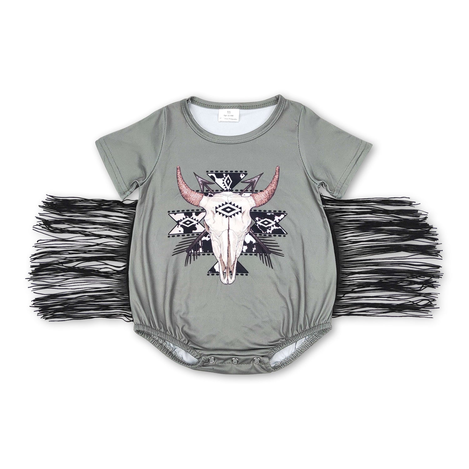 Short sleeves olive bull skull tassels girls western romper - 0-3M is backordered and will ship as soon as it is back in stock.
