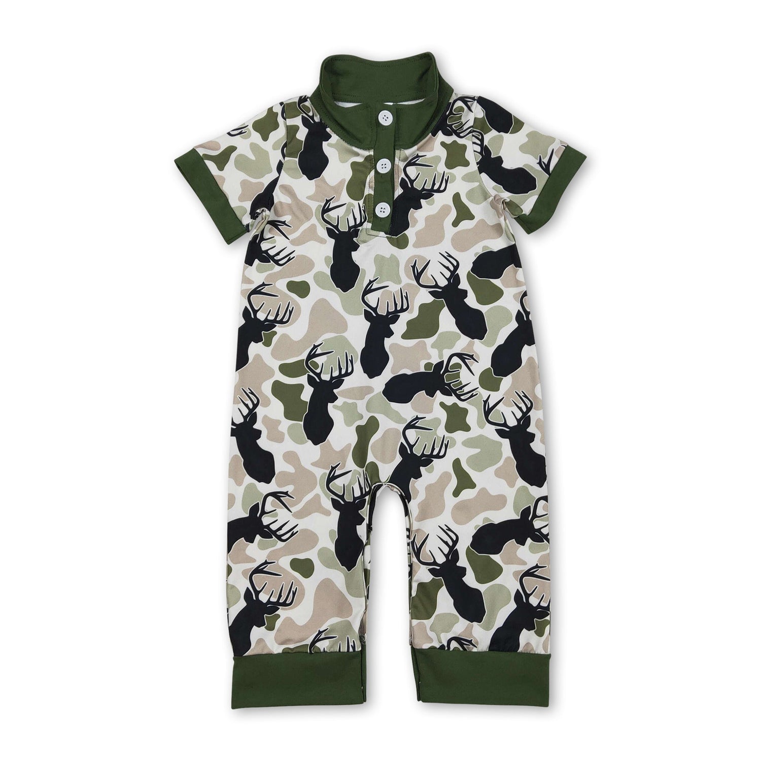 Short sleeves green camo deer baby boy polo romper - 0-3M is backordered and will ship as soon as it is back in stock.