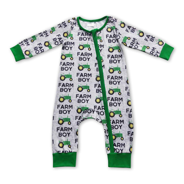 Green tractor farm boy ruffle baby zipper romper - 0-3M is backordered and will ship as soon as it is back in stock.