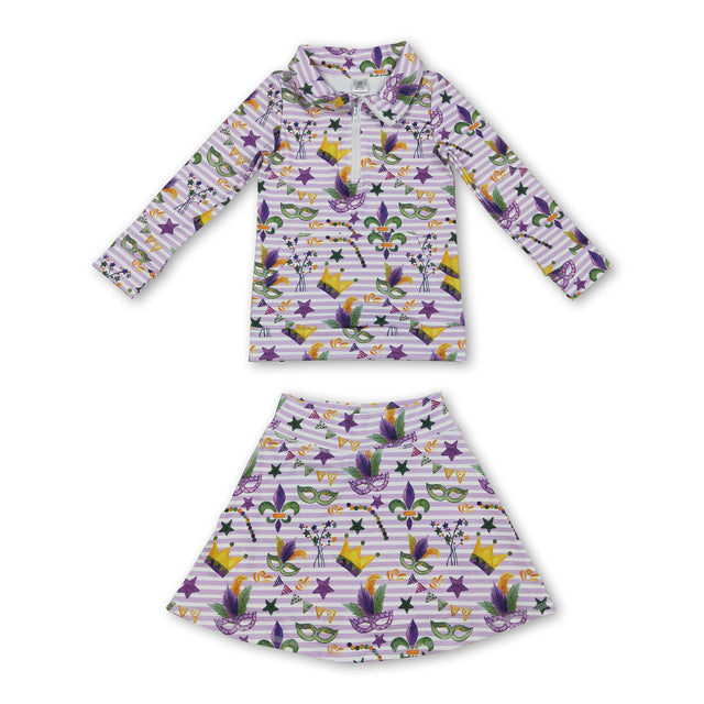 Purple stripe crown pullover skirt girls Mardi Gras active set