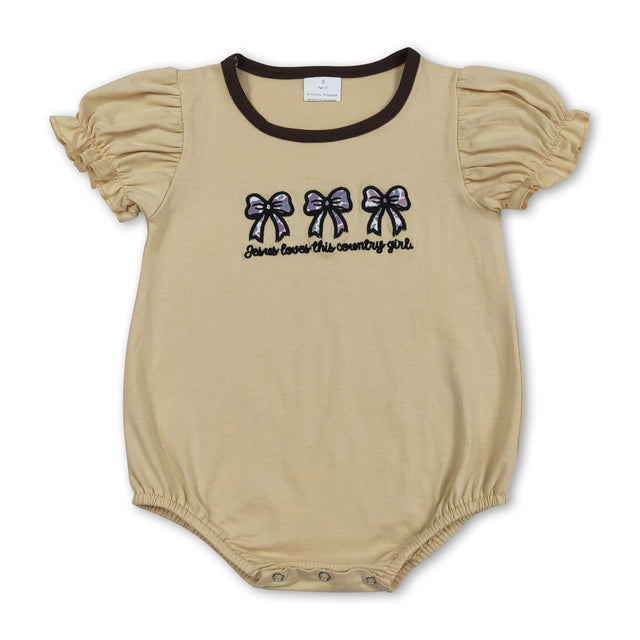 Jesus love this country girl camo bow baby girls romper - 0-3M is backordered and will ship as soon as it is back in stock.