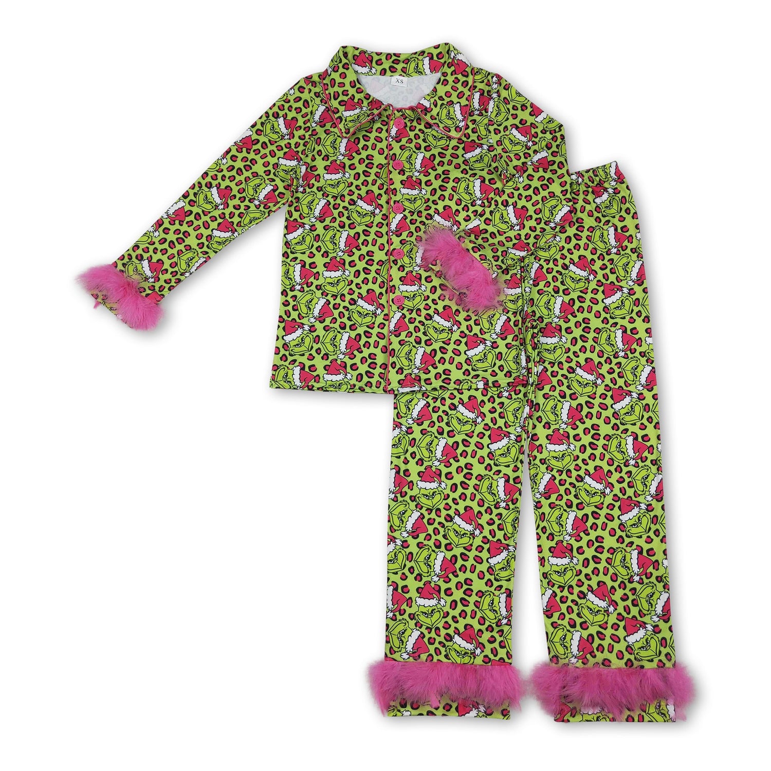Leopard green face fur adult women Christmas button down pajamas - XS is backordered and will ship as soon as it is back in stock.