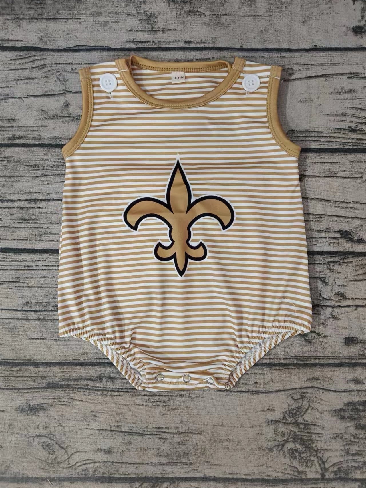MOQ 3 pcs sleeveless khaki stripe baby team romper - 0-3M is backordered and will ship as soon as it is back in stock.