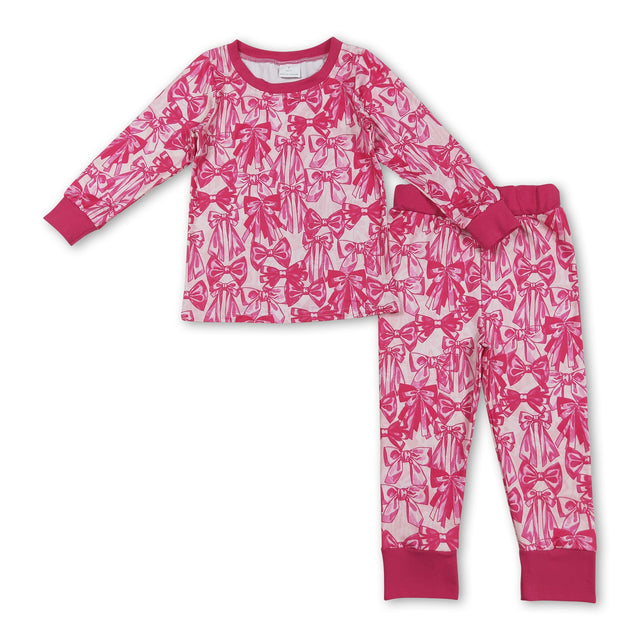 Hot pink bow long sleeves top pants kids girls pajamas - 3-6M is backordered and will ship as soon as it is back in stock.
