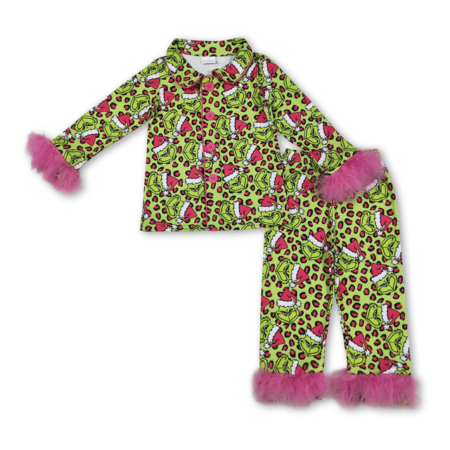 Leopard green face fur girls Christmas button down pajamas - 3-6M is backordered and will ship as soon as it is back in stock.