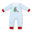 Light blue stripe Christmas tree baby boy romper - 0-3M is backordered and will ship as soon as it is back in stock.