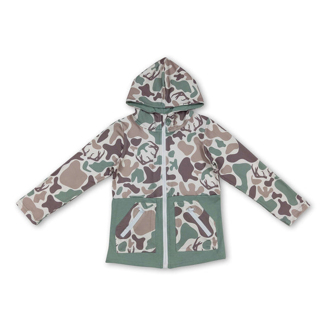 Long sleeves camo seer pockets kids hooded jacket - 3-6M is backordered and will ship as soon as it is back in stock.