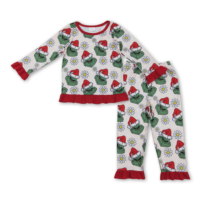Long sleeves ruffle floral green face girls Christmas pajamas